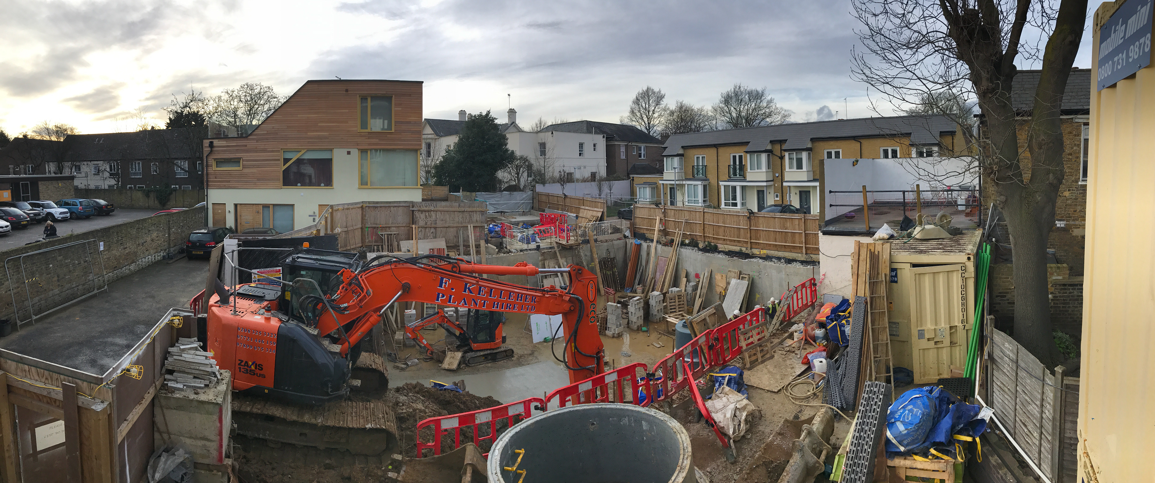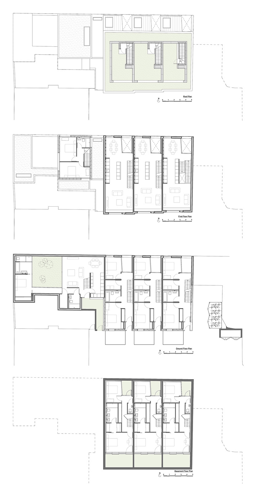 Our main goal was to deliver an innovative project on a difficult site. Our proposal breaks the traditional terraced layout by introducing an inverted plan to make a best use of this specific backland site. Using a traditional plan would cause the rear garden to be permanently in shadow and the front of the house would require treatment to provide defensible space. This culminated in placing the garden on the roof, not as a hardscaped terrace as would be common, but as a fully planted extensive green roof. Therefore this garden now enjoys full southern sun and views all times of the year. The perforated pergola acts as a privacy screen and directs views. The living area is transferred to the first floor therefore receiving long outlook and uninterrupted light throughout the day- the areas that need it the most. The narrow floor plan allows for all services to occupy dark central areas so all habitable rooms are brightly lit. We choose to make the ground, basement, and upper garden pergola in perforated metal set in front of the wall to create a sense of lightness and pattern, diffusing the mass. The brick is only at first floor level, thus making the appearance of the houses smaller in stature. Our design utilises relatively low cost yet quality materials such as mixedstock brick, perforated powder-coated steel, and zinc standing seam roofing to amazing effect. The 3-bed corner house is ingeniously designed to eliminate overlooking to nearby neighbours.