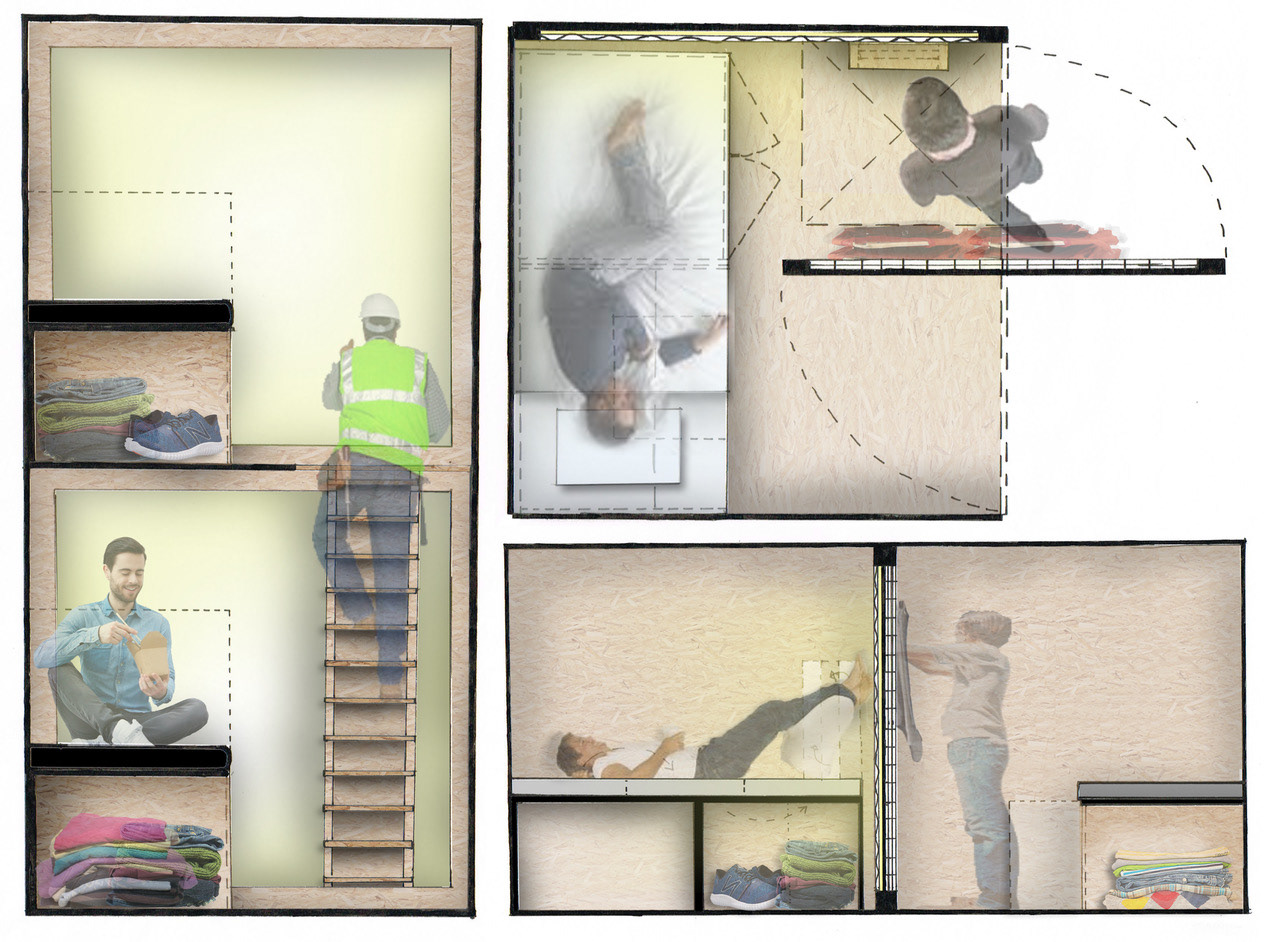 Temporary Accommodation Design Competition for Commonweal Housing There is always unfortunately a persistant need for temporary housing across the world for economic migrants, refugees, seasonal workers and other vulnerable populations. We are presented here with a genuine opportunity to provide accommodation to a specific group that would otherwise be sleeping rough in dangerous and unhygenic conditions. In examining the typical person in need, construction labour was a unifying theme. With that in mind, the concept of using scaffolding from the building industry to create aggregations of cubes and rectangles seemed the obvious choice. Its ubiquity, low cost, versatility, and ease of installation and break-down makes it a site-specific, robust, cost effective, and contextual choice. The 2m x 2m x 2m living cubes are delineated with OSB panels that are inexpensive and appealing for its texture and visual quality. Interspersed with translucent polycarbonate panels for light, the panels are one size, and easily interchangable for new configurations, repair, or take down for installation elsewhere. They can be easily affixed with large cable ties, making installation complete in minutes. A pivot door made from polycarbonate and wire mesh allow for simple entry and exit, and doubles as hanging space for clothes and small items. The base floor is portable, mounted on casters and offers a bed space that folds up to access the built-in desk and storage box. All panels and fittings are commonly available and require no specialist knowledge or tools to erect or break down.