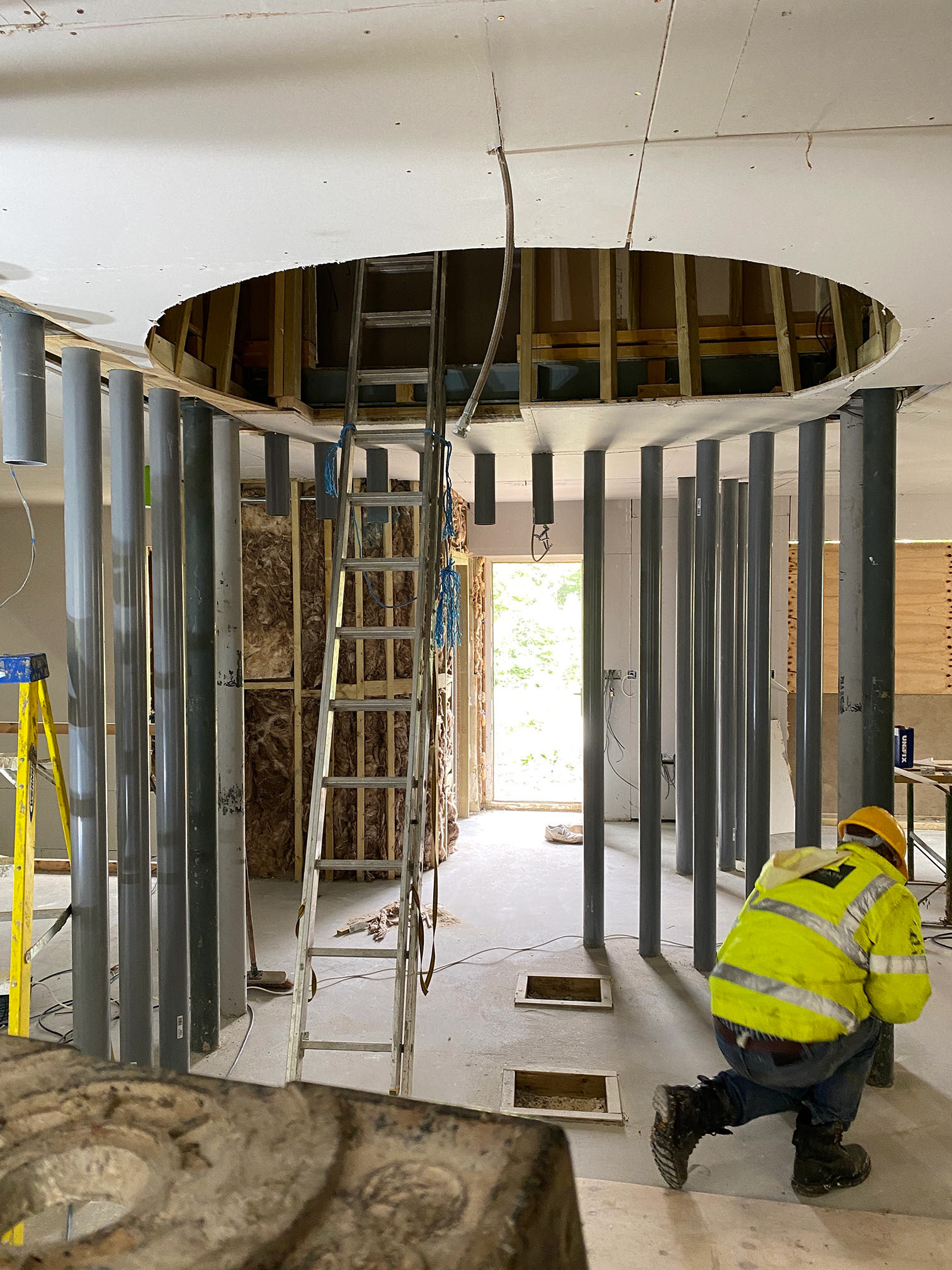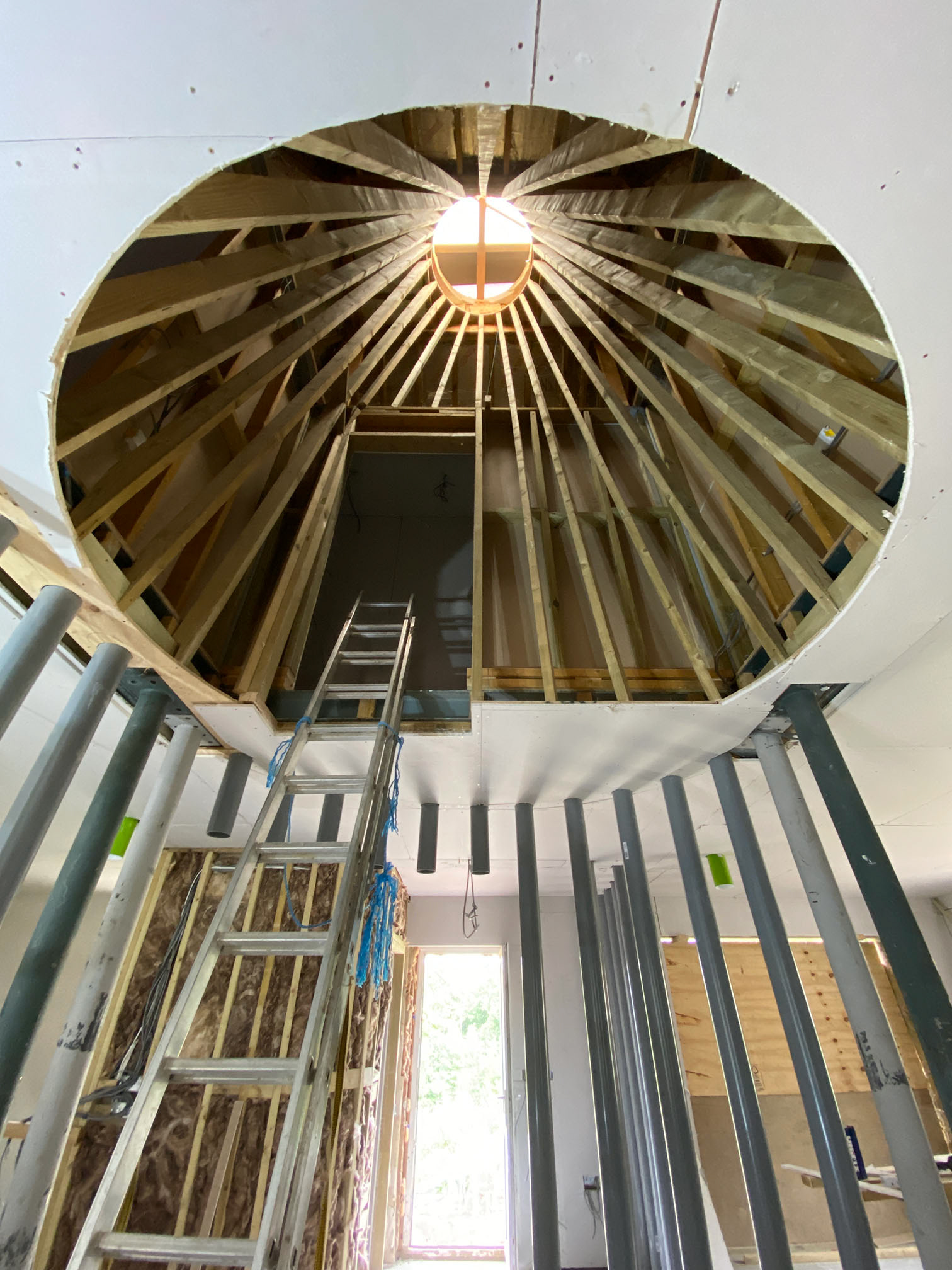 The pre-fabricated metal spiral staircase with a circular rooflight light above makes up the main feature of the house. This enables natural day and sunlight to flood into the ground floor spaces, whilst the generously sized dormers allow light to enter the rooms on first floor.