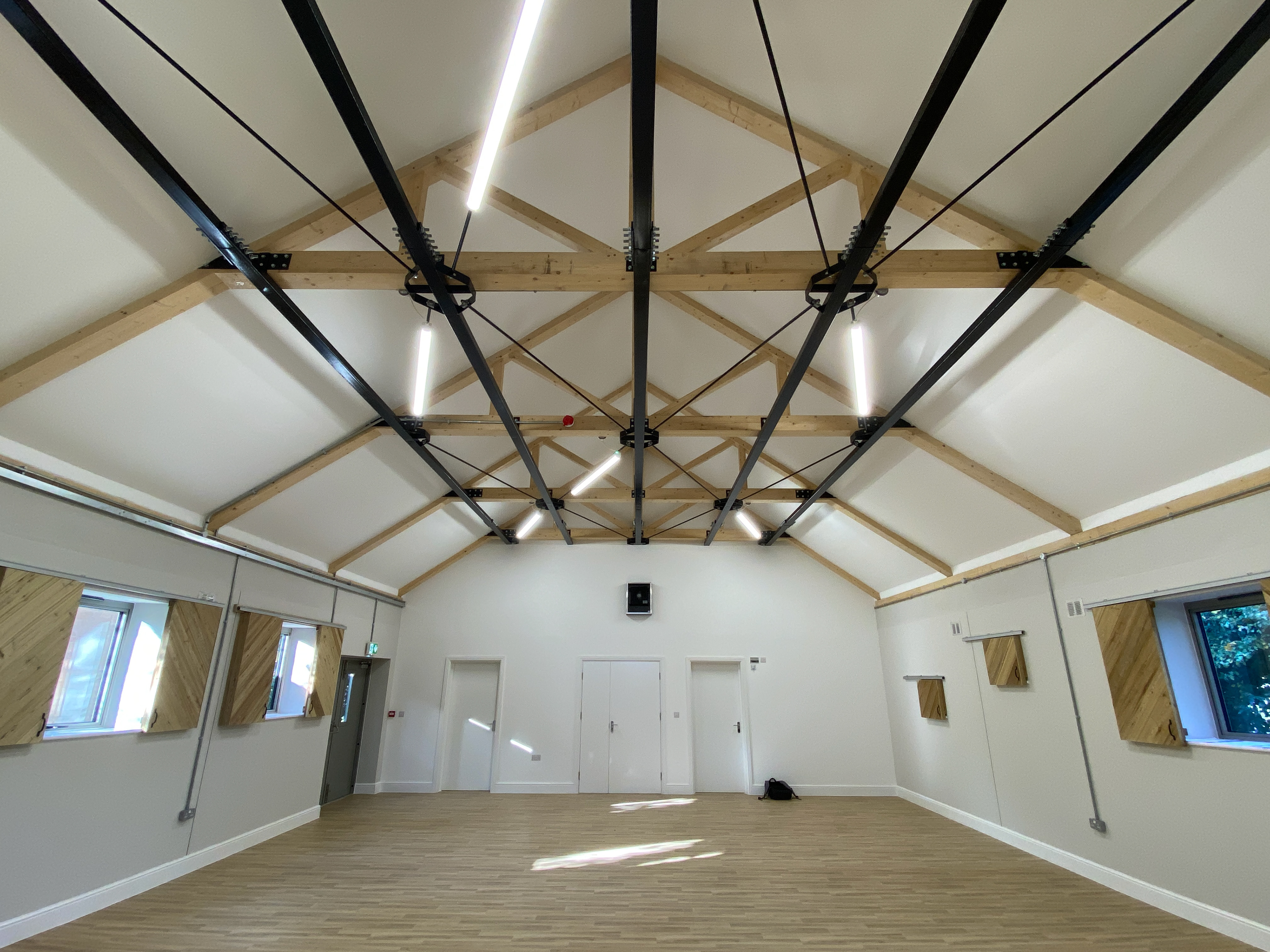 We suggested a large hall space with an open ceiling using a system of timber chords and placement of high level windows so that the inner walls of the building could be utilised. Playful placement of window levels to give an interest to the building facade. Aluminium purple window frames and purple vinyl flooring matches the Scouts colour insignia. Proposals such as lightweight metal roofing, single skin block with pretreated Scottish timber, a pitched glue-laminated truss structure, and coloured aluminium window frames all work towards reduction of expense whilst creating delightful architecture.
