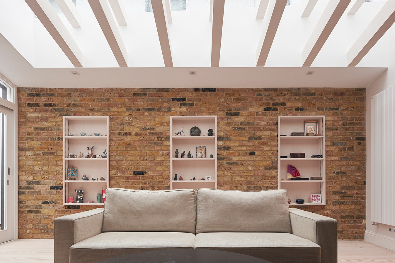Completion 2015 Budget £75,000 Residential extension A fascinating couple from continental Europe came to us with a small former worker's cottage near Notting Hill with a clear problem: although the standard Victorian layout served their needs, the rear of the house with a pocket garden was completely shut off and horribly dark. We proposed a side return extension to infill the damp and unused space and created an elevated lovely breakfast area fully glazed to the garden. The new space is open, light, and inviting with a timber-slatted roof structure that creates privacy from neighbours looking down whilst generating dancing angular shadows throught the day. The white plaster of the existing exterior rear elevation is nicely contrasted with anthacite zinc cladding.